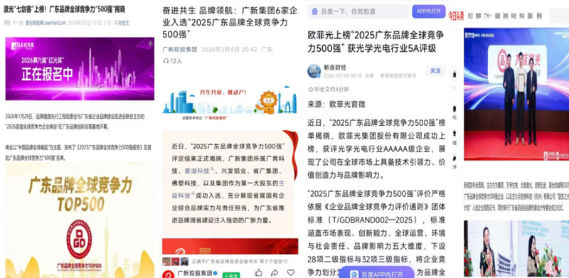 在2026年1月29日首届全球竞争力企业峰会上,共有华为、腾讯、比亚迪、美的、格力、广药、王老吉、华润、大疆、广汽、中兴、广州酒家、TCL、立白、南方电网、海信、小鹏、中国平安、立讯精密、华发、富士康、OPPO、顺丰、vivo、南方航空、荣耀、招商银行、中国广核、迈瑞医疗、格兰仕、中集、创维、希音、传音、惠科、亿纬锂能、李锦记、欣旺达、温氏、德赛电池、欧菲光、万宝、影石、联塑、广船、佛山照明、大族激光、欧派、深南电路、慕思、海天、马可波罗、薇美姿、昊志机电、双喜电器、长园科技、得胜电子等500家AAA级及以上等级企业入选“2025广东品牌全球竞争力500强”。