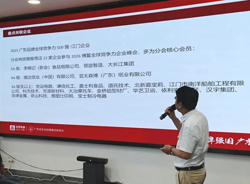 会议期间,重点发布了《2025广东品牌全球竞争力500强江门企业》,共有维达纸业(中国)、亚太森博(广东)纸业、世运电路、谦信化工、嘉士利食品、道氏技术、北新嘉宝莉、江门市南洋船舶、科杰技术、芳源新材料、大冶摩托车、金桥铝型材厂、华艺卫浴、依利安达电子、汉宇集团、华津金属、依山科技、雅图仕印刷、宝士制冷电器等20家江门企业获评“2025广东品牌全球竞争力500强”。