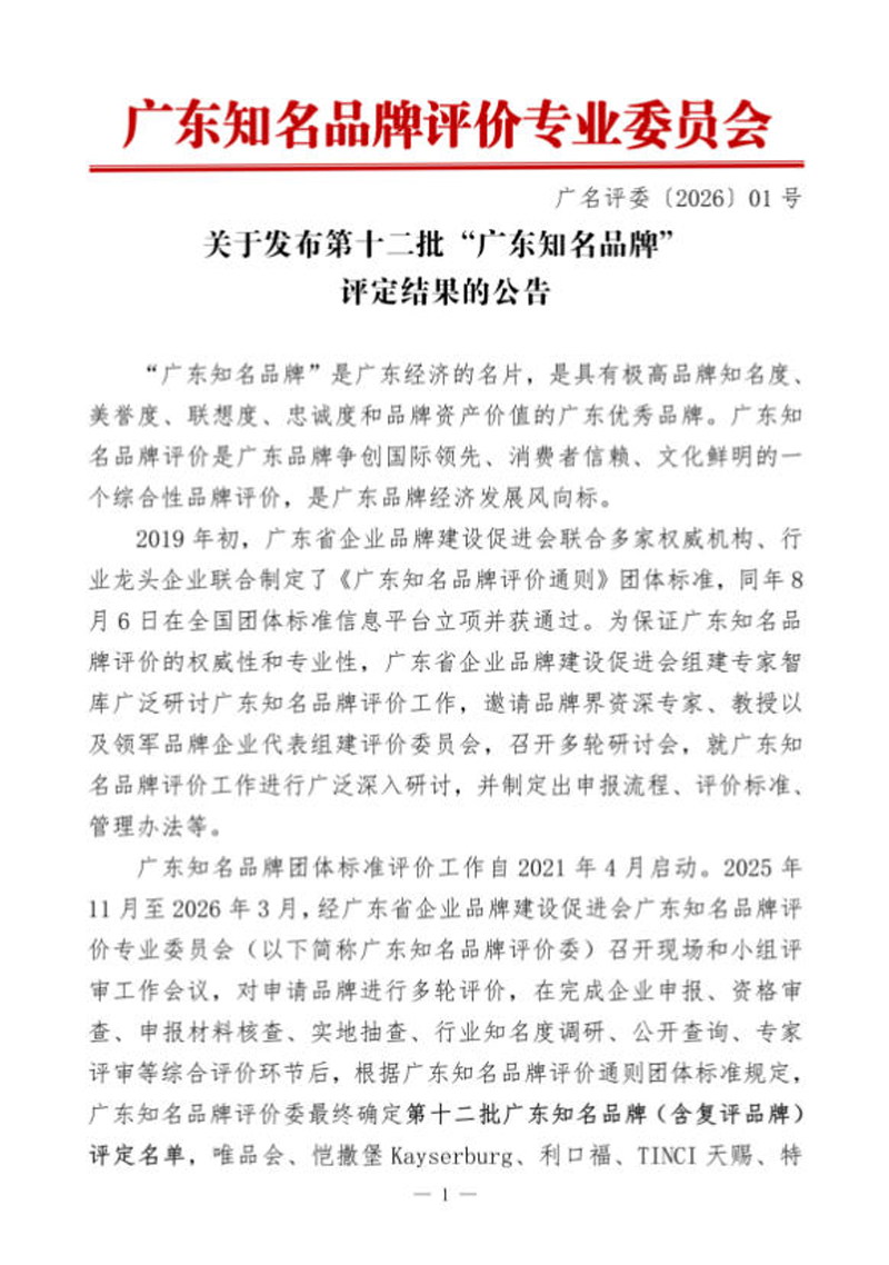 广东知名品牌团体标准评价工作自2021年4月启动。2025年11月至2026年3月,经广东省企业品牌建设促进会广东知名品牌评价专业委员会(以下简称广东知名品牌评价委)召开现场和小组评审工作会议,对申请品牌进行多轮评价,在完成企业申报、资格审查、申报材料核查、实地抽查、行业知名度调研、公开查询、专家评审等综合评价环节后,根据广东知名品牌评价通则团体标准规定,广东知名品牌评价委最终确定第十二批广东知名品牌(含复评品牌)评定名单,唯品会、恺撒堡Kayserburg、利口福、TINCI天赐、特发集团、科翔股份、新兴、长华集团CHANGHUA、TAKSTAR得胜、银河电力INHE、坚朗、东呈、南华、Pahnli芭菲、伟昌铝材、SUNS三思纵横、雷登电梯GOTS、GROWATT古瑞瓦特、西陇科学、金石三维Kings、嘉合劲威(POWEV)、天邦达、百穰、粮丰园、WAITLEY威特利、素士SOOCAS、良仕、NOHON诺希、GURKI固尔琦、HOLD豪德、天年方舟、善百年、恒天伟焱IBE、企知道、金生缘、善草纪、山克SPECIALTY&FOCUS、动力火车、WISSCO威仕高、三孚新科、鑫众晶、信牌TRUST、同益新、ASENSING、深大众志、KUMI库觅、QICAI奇才、通洋、永佳润YJR、农夫山庄、可为锡业KEWEI TIN、创仁科技CR、永达辉YONGDAHUI、尚成、毫欧、永成光电子YC、东冠皇冠、声音纪元Dido、玩视、成兴光XINGLIGHT、奇辉箱包OBOX、汉记、兴标美照明BUME、小勇(YYDROBO)、中科为、BOON保安医疗、迪奥数控OSDIOU、展护卫EASTOPS等共68个申报品牌获评“广东知名品牌”。根据广东知名品牌评价工作要求,现对获评品牌进行公示。